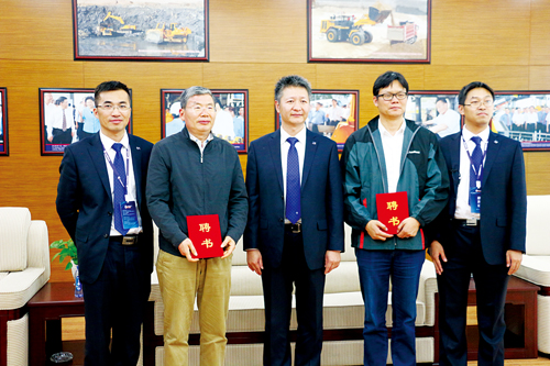 黃海波(中)與新聘柳工科學家胡永彪(左二)、曹華軍(右二)合影