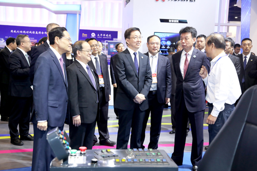 圖為中共中央政治局常委、國務院副總理韓正(左三)、自治區(qū)黨委書記鹿心社(左二)、自治區(qū)人民政府主席陳武(左一)、國家科技部副部長張建國(右二)等領(lǐng)導到 柳工農(nóng)機產(chǎn)品展位參觀指導工作,公司技術(shù)顧問章二平(右一)向領(lǐng)導介紹公司及產(chǎn)品情況。